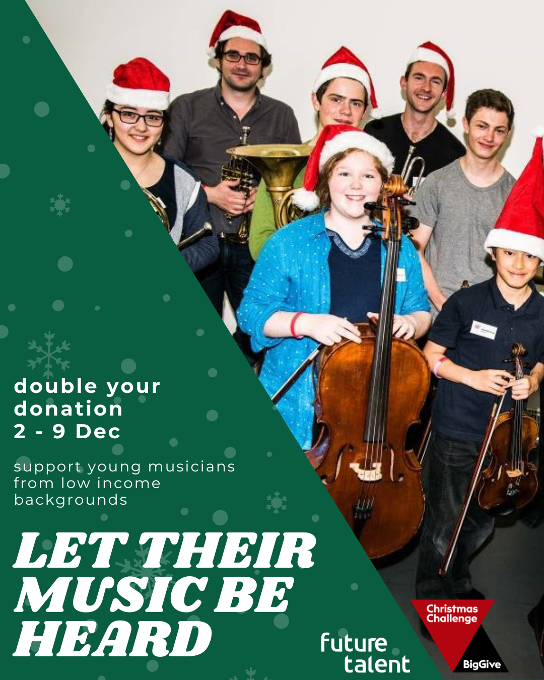 A donation to the Big Give Christmas Challenge will double your impact, helping provide financial grants and opportunities to those in need. A young person continuing their music lessons, when their family might've been forced to cancel them. Buying their first instrument. Paying for the bus to orchestra rehearsal. And so much more.